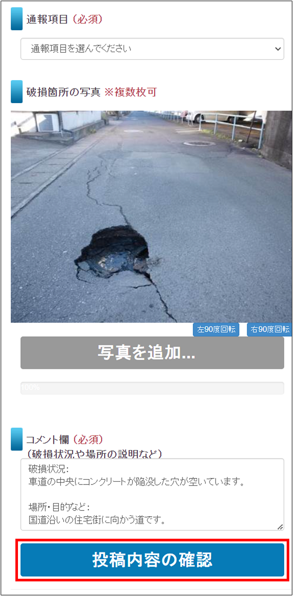 新規投稿と同様に入力画面が表示されますので、必要に応じて項目の選択や、写真の追加といった修正を行います。
